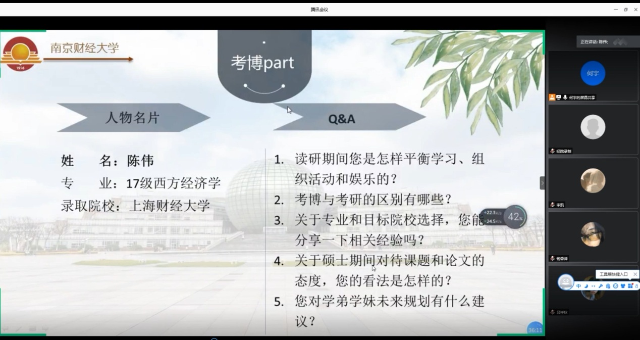 11月21日晚,我院举行线上考博经验分享会。五位硕士毕业于我校的经济类博士及bat365在线登录网站注册赠送36全体2019级硕士生参加了本次经验分享交流会。交流会由bat365在线登录网站注册赠送36研究生会主席姚阳阳主持。