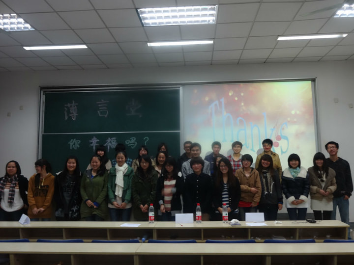 2012年11月9日晚七点整,专一101,厚薄学社主办的第一届薄言堂“你幸福吗?”演讲比赛正式开始。本次比赛的评委由我院学生会副主席韩颖、厚薄学社前社长宗琴和红山学院厚薄学社负责人王乃鑫担任。厚薄社员陈炎和王文静共同主持此次比赛。