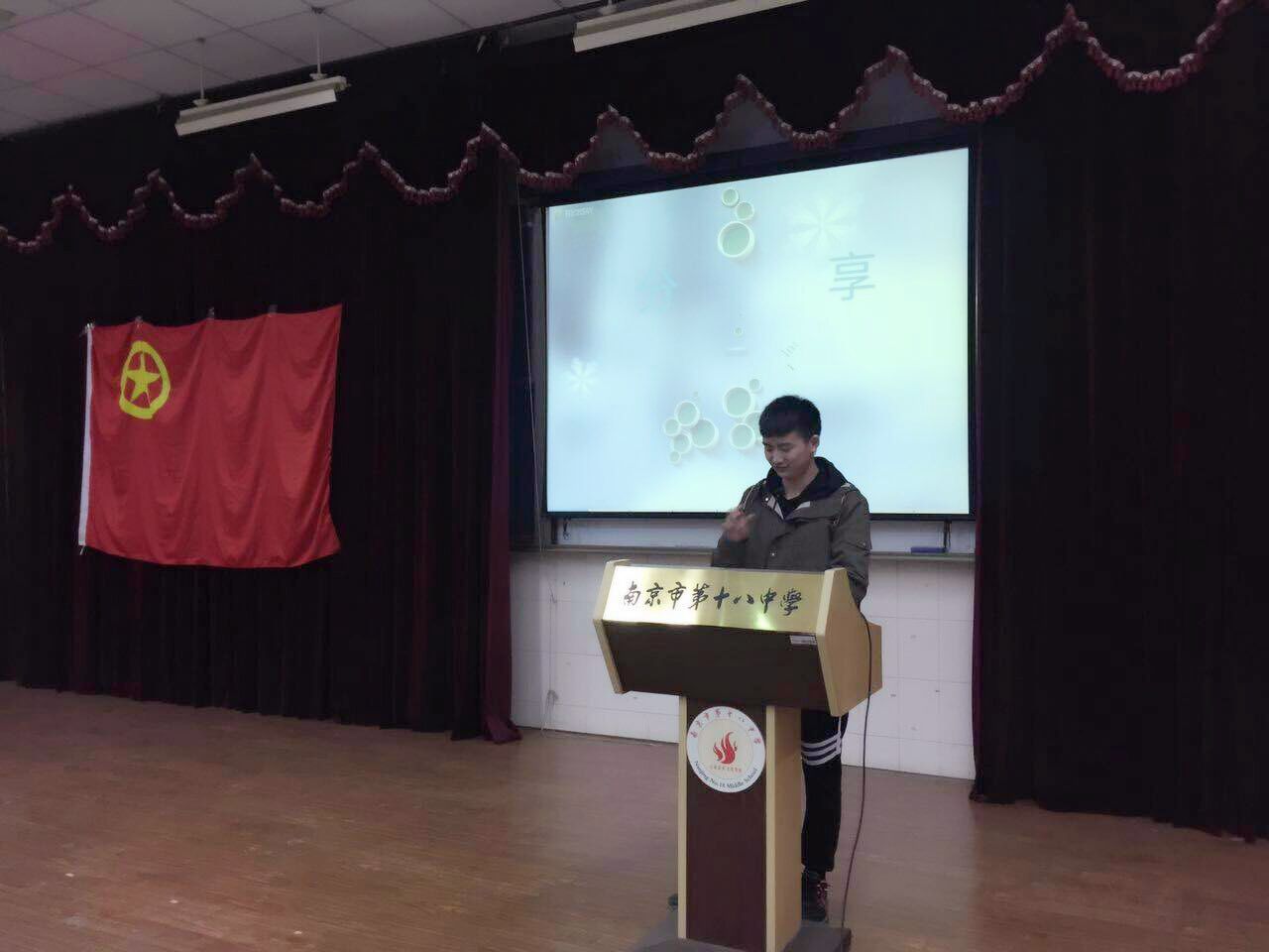 大学是学习生涯的一个转折点,也是我们向梦想发起冲击的一个新起点。为帮助中学生更好了解大学生活,应南京市第十八中学邀请,5月10日下午,我院优秀学生党员、国家奖学金获得者杨帅同学,前往大学生社会实践基地的南京市第十八中学,开展“奋斗的青春最美丽” 主题经验分享会。活动由第十八中学的杨意仙老师主持,第十八中学的部分师生到场聆听了分享会。