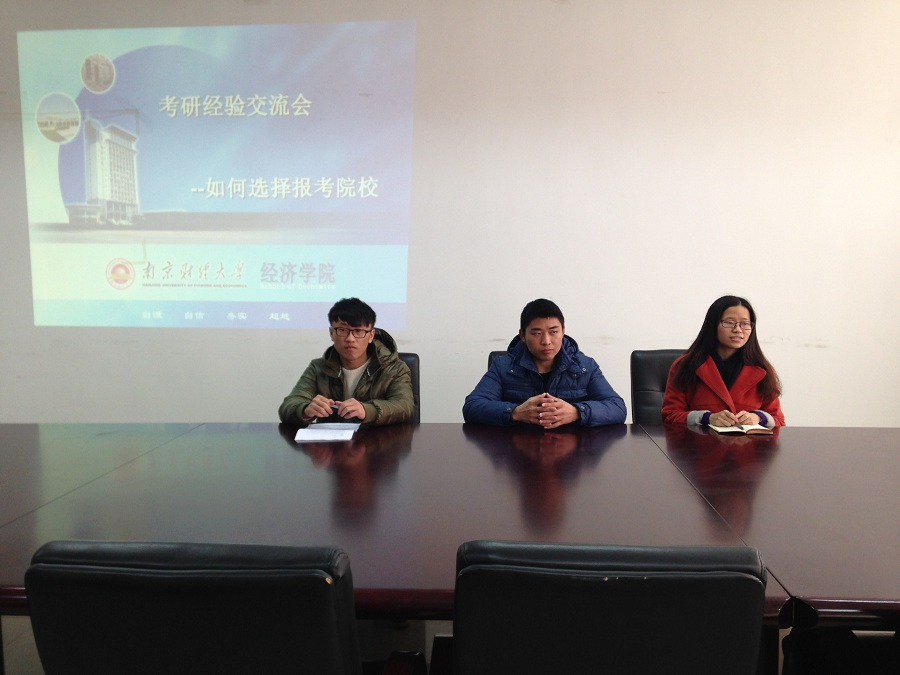 11月27日下午,仙林校区经济学科楼307室举办了以“如何选择考研院校”为主题的考研经验交流会,此次交流会由学生处主办,我院承办。交流会邀请到的主讲嘉宾是仝玉超、倪蓉、马磊三位同学。