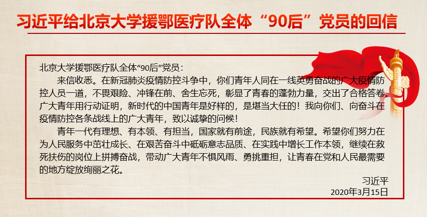 为引导青年学生深入学习领会习近平总书记给北京大学援鄂医疗队全体“90后”党员的回信精神,3月25日,院党委副书记袁怡琨通过腾讯会议为bat365在线登录网站注册赠送36学生党员及学生干部讲授院级信仰公开课“以实际行动践行青年的担当和使命——学习习近平总书记给北京大学援鄂医疗队全体“90后”党员的回信精神”。袁书记说:习近平总书记的回信言简意赅,充分肯定了广大青年在疫情防控斗争中彰显的青春力量、作出的积极贡献,体现出总书记对新时代广大青年的殷切期望。同学们应该凝聚思想共识,增强与祖国同命运共奋进的责任感和使命感。同学们纷纷表示将会立足岗位,勤于学习,勇于实践,把最美好的青春献给祖国和人民,谱写壮丽的青春之歌。