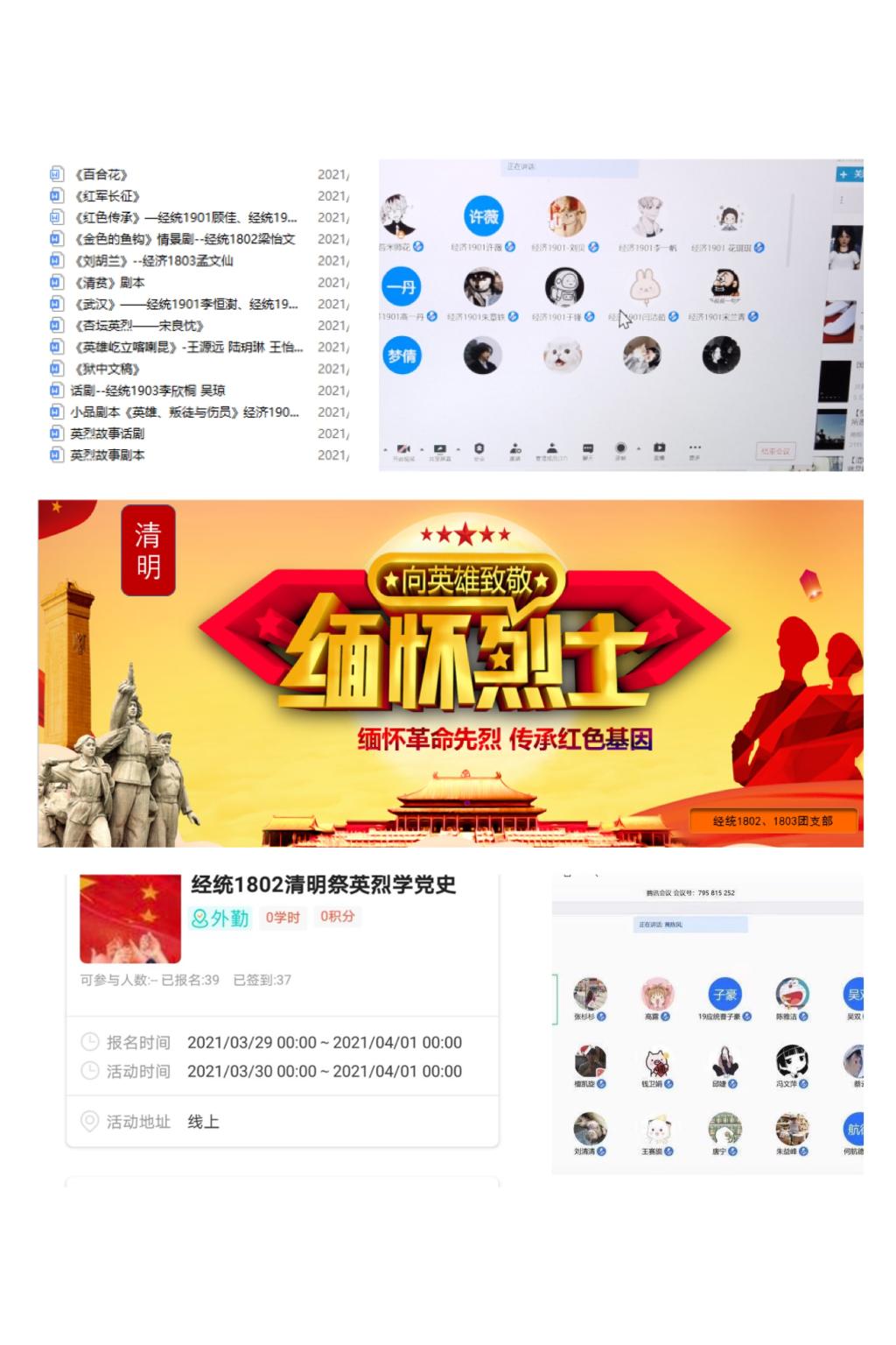 各团支部相继开展以“缅怀革命先烈、传承红色基因”“经典随行、做时代好青年”“清明追思 缅怀先烈”“红色基因代代传——清明祭英烈 共铸中华魂”为主题的团日活动。经统1802、1803团支部联合开展了网上祭英烈活动,通过网上献花、留言等方式祭奠先烈,表达敬意。经济2001团支部通过“挑战杯”红色专项活动的经验交流,分享了革命事迹和英雄故事,并在“时代青年承诺书”上署名以完成承诺,汲取奋发精神,传承红色基因。经济1901团支部、研究生团支部通过腾讯会议线上学习“四史”,分享革命事迹,缅怀抗日保家卫国的烈士们,交流心得体会,感悟祖国发展和日益强大的精神动力源泉。经济1902、经济1903团支部集中重温入团誓词,聆听革命故事,宣传英烈的感人事迹,将红色基因融入青年血夜。经统1903、经济2003团支部讲述革命英烈的先进事迹,缅怀先烈,发扬革命先辈的优良传统。经统2001团支部以集中观影的方式,重温老一辈革命家在风雨飘摇的年代里为国家赴汤蹈火的革命情怀,接受了深刻的革命传统教育和爱国主义教育。bat365在线登录网站注册赠送36分团委和学生会联合开展“传承红色基因、清明云祭英烈”线上主题学习会,以“云”祭奠的方式,缅怀为民族独立,为人民解放抛头颅、洒热血的革命英烈,追思那些为正义事业逝去生命的英雄。同学们纷纷表示要牢记革命先烈的伟大功绩,继续发扬革命先辈的优良传统,传承红色基因,缅怀先烈,勇立时代潮头、争做时代先锋。