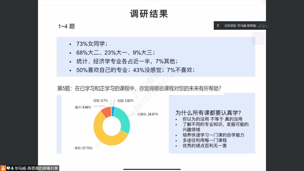 此外,陈思易校友还讲述了就业的经验体会。她从分享在毕马威的工作实际出发,以“四大”实习工作经历、专业前景和大数据相关就业现状、职场自我提升和对大学期间的建议为思路,分享了自己的实习、就业经历。建议同学们:跳出学生思维,体验多种实习经历,提高自身能力,积累工作经验,让勤奋在自己心中生根发芽,勤奋+坚持,结果永远不会太差。