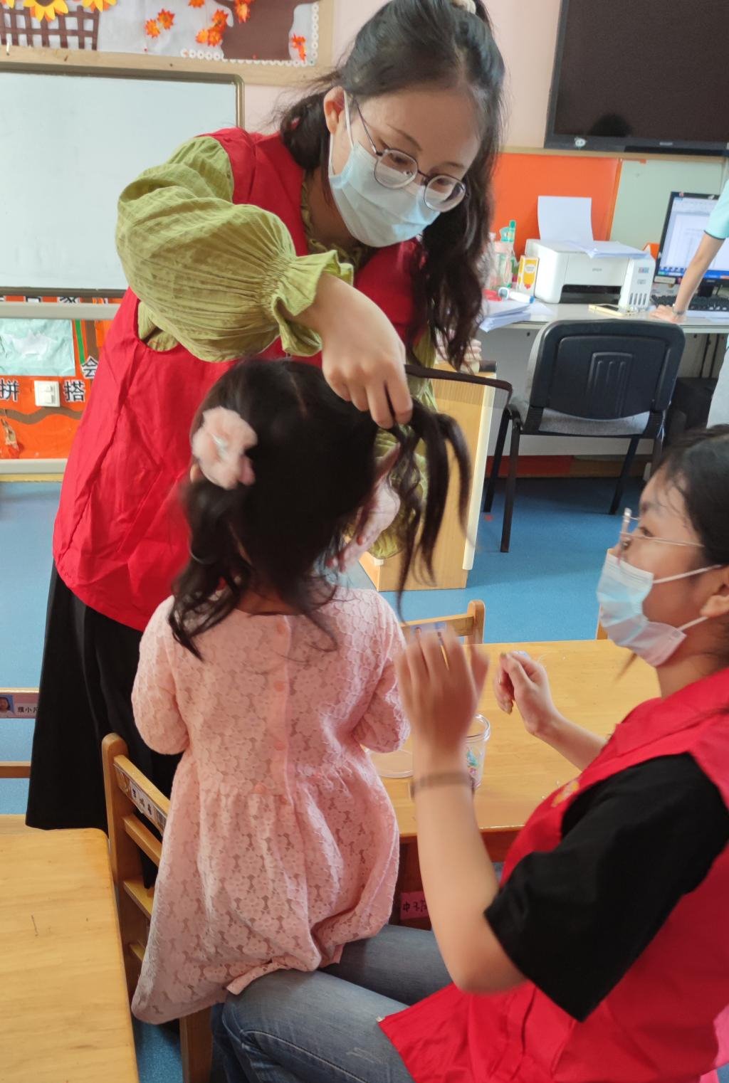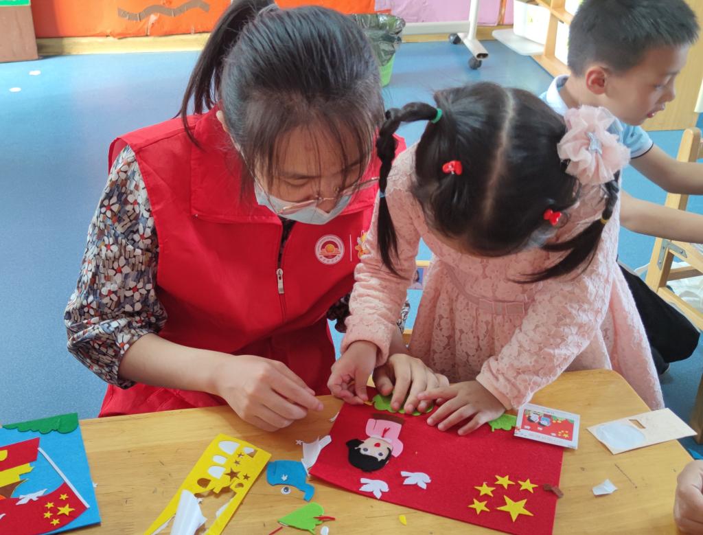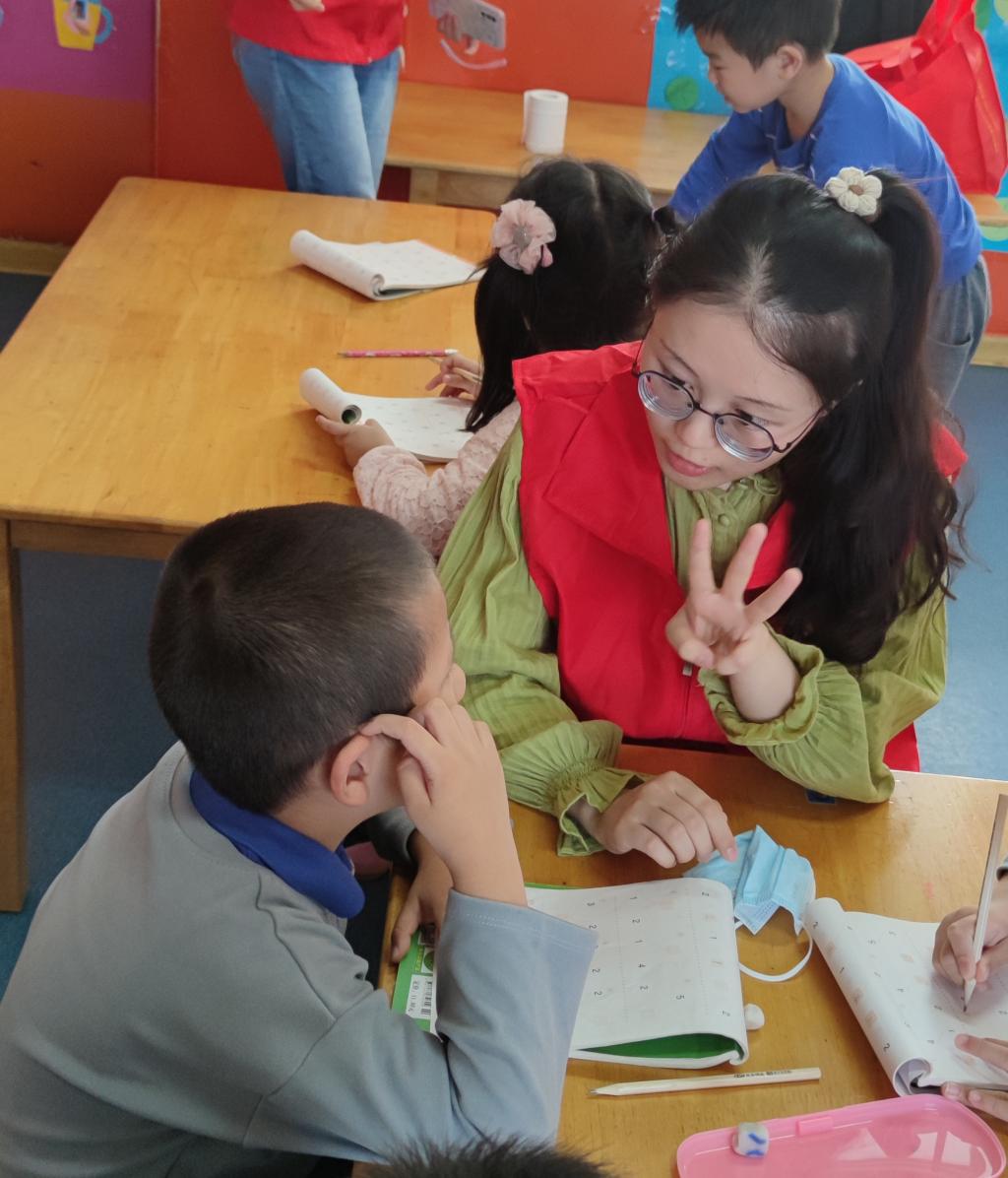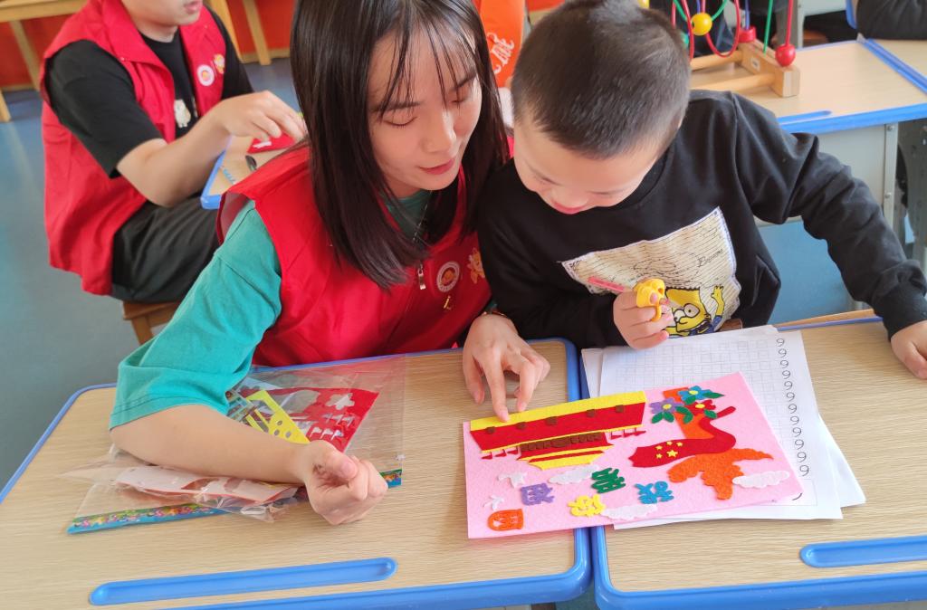 在康复中心,同学们参与活动课堂教学,与孩子们温暖互动:有的同学陪伴他们练习掌握标准化的发音,有的同学教孩子们简单计算,有的同学和孩子们一起游戏,康复中心的孩子们在同学们的耐心教导与鼓励下,都努力地做到最好。最后,同学们与孩子们一同完成“我爱你祖国”、“共筑中国梦”等爱国主题贴纸,表达自己对祖国的心声和情感。
