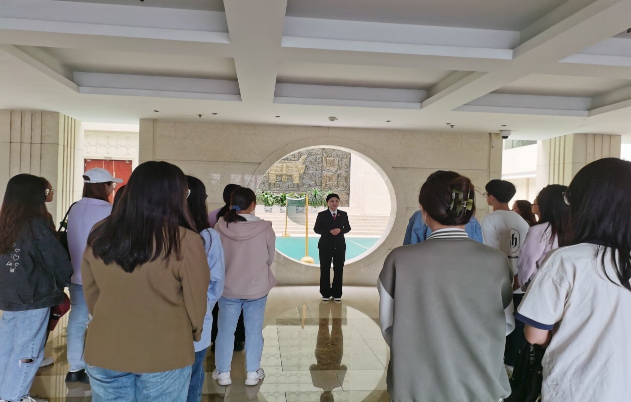 在法院研究室柳俐慊主任的带领下,同学们来到了法院的正大厅,最先映入眼帘的是大厅正中央的一块方中有圆的墙壁,寓意着不以规矩不成方圆。从圆形孔中可以看到远处的一处青铜墙壁,上面印着一块青铜三足鼎,意味着法律在我们的生活中举足轻重的作用。而在青铜墙壁上方还有着网格状的设计,寓意着法网恢恢。整个大厅由透明玻璃顶罩住,在增加了室内采光的同时,也寓意着司法裁判公开透明。仅仅只是参观了法院大厅,便让同学们感受到了法律的庄严。