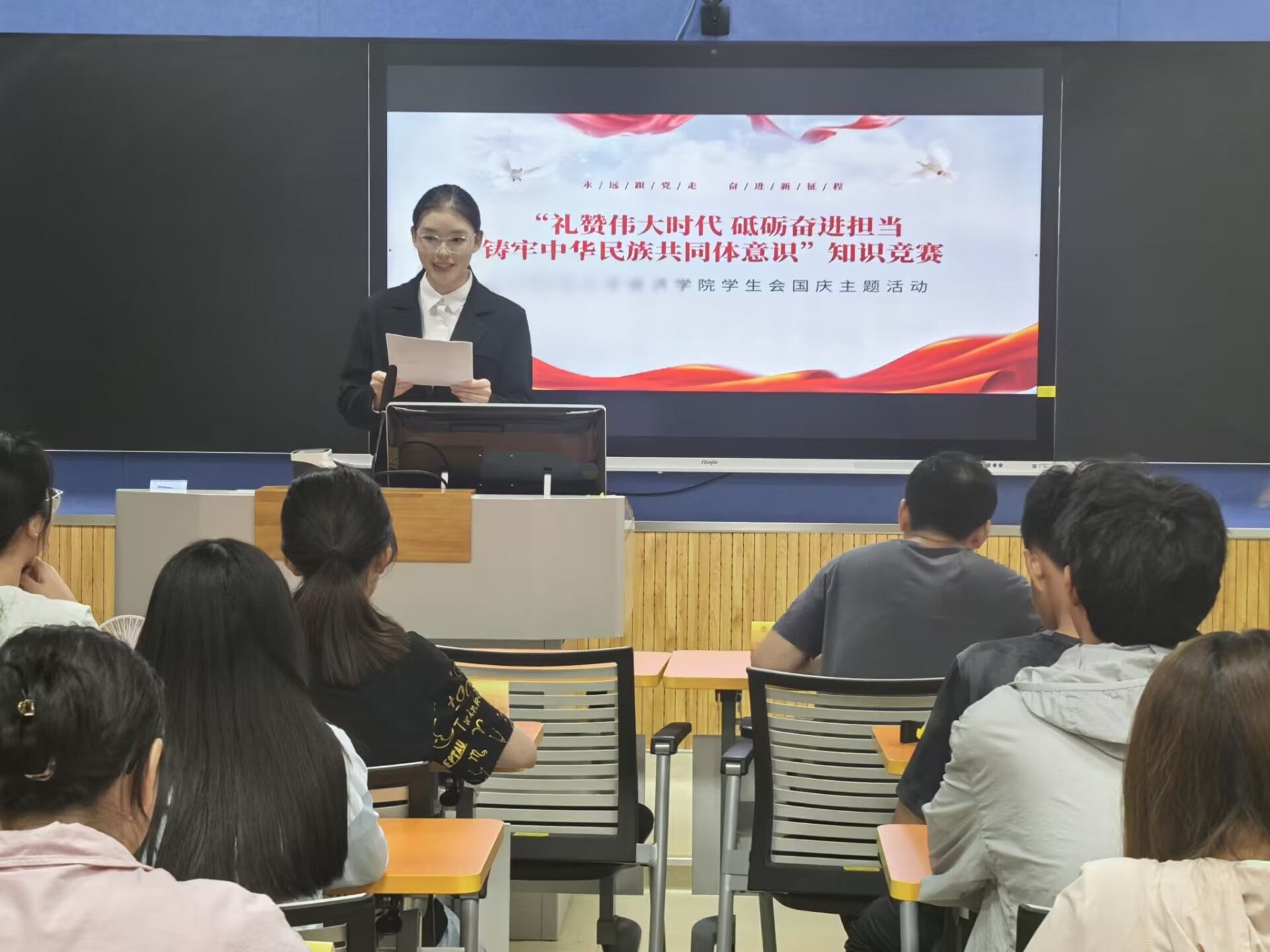 金风送喜,举国同庆。为庆祝新中国75周年华诞,强化中华民族共同体意识,深入学习贯彻党的二十届三中全会精神,贯彻落实习近平总书记关于加强和改进民族工作的重要思想,深入推进民族团结进步宣传教育工作,持续铸牢中华民族共同体意识,9月27日,我院于博文楼104教室开展“礼赞伟大时代,砥砺奋进担当,铸牢中华民族共同体意识”知识竞赛。活动通过集中授课和知识竞答相结合的方式,学习贯彻习近平总书记关于加强和改进民族工作的重要思想,开展党的民族政策法规宣传教育,大力营造爱党爱国爱社会主义的浓厚节庆氛围。本次活动由2024级本科生辅导员张闻老师主讲团课,部分大一、大二学生参与活动。