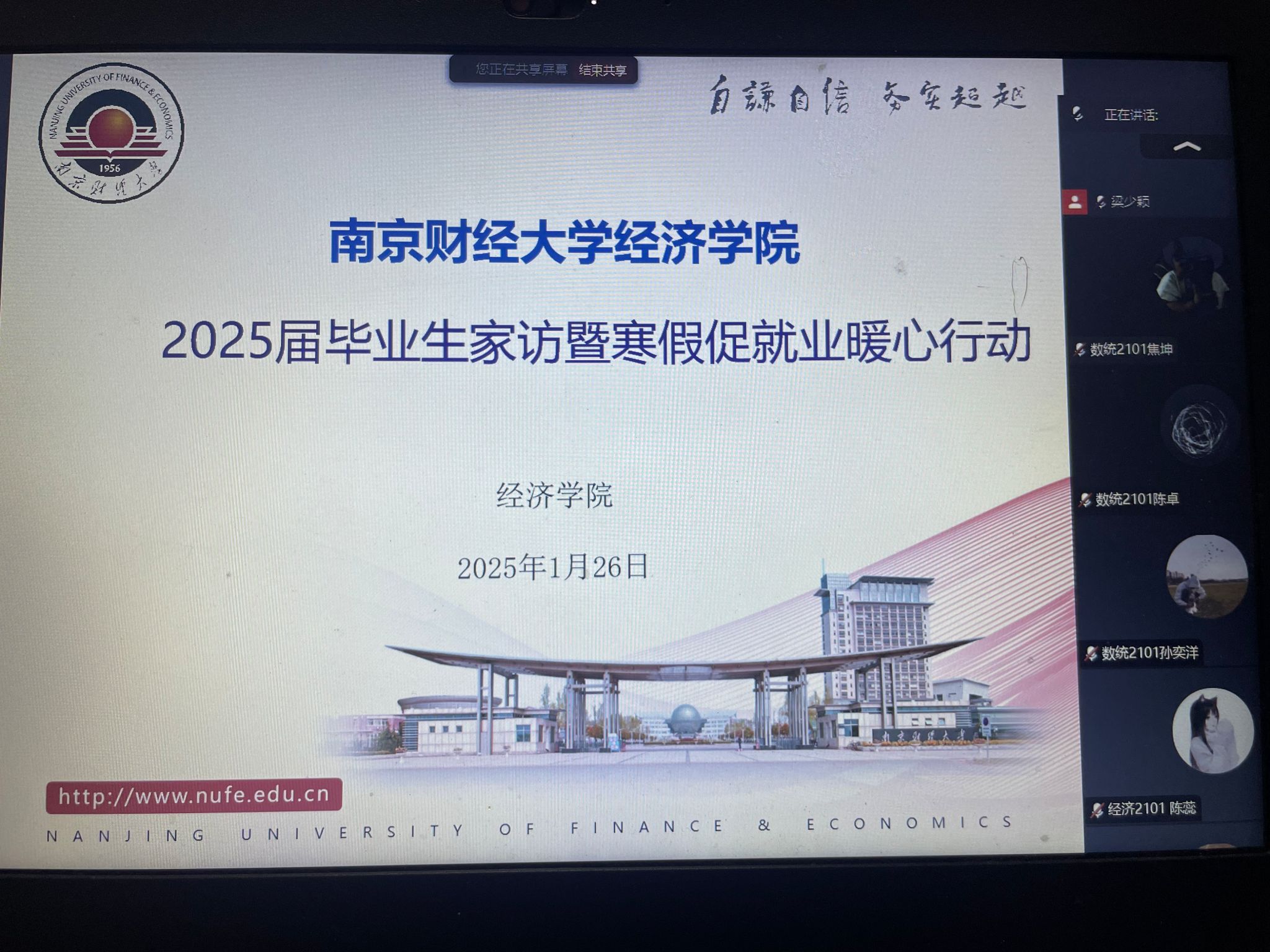 寒假期间,我院积极响应教育部关于开展高校毕业生“寒假促就业暖心行动”的号召,精心策划并实施了2025届经济困难毕业生寒假线上家访暨寒假促就业暖心行动会,旨在通过线上家访的形式,加强与毕业生及家长的沟通联系,精准推送就业信息,提供就业指导服务,助力毕业生实现高质量就业,学院党委副书记贾亦璞、辅导员老师梁少颖和潘怡、部分学生家长以及全体2025届经济困难毕业生参加了会议。
