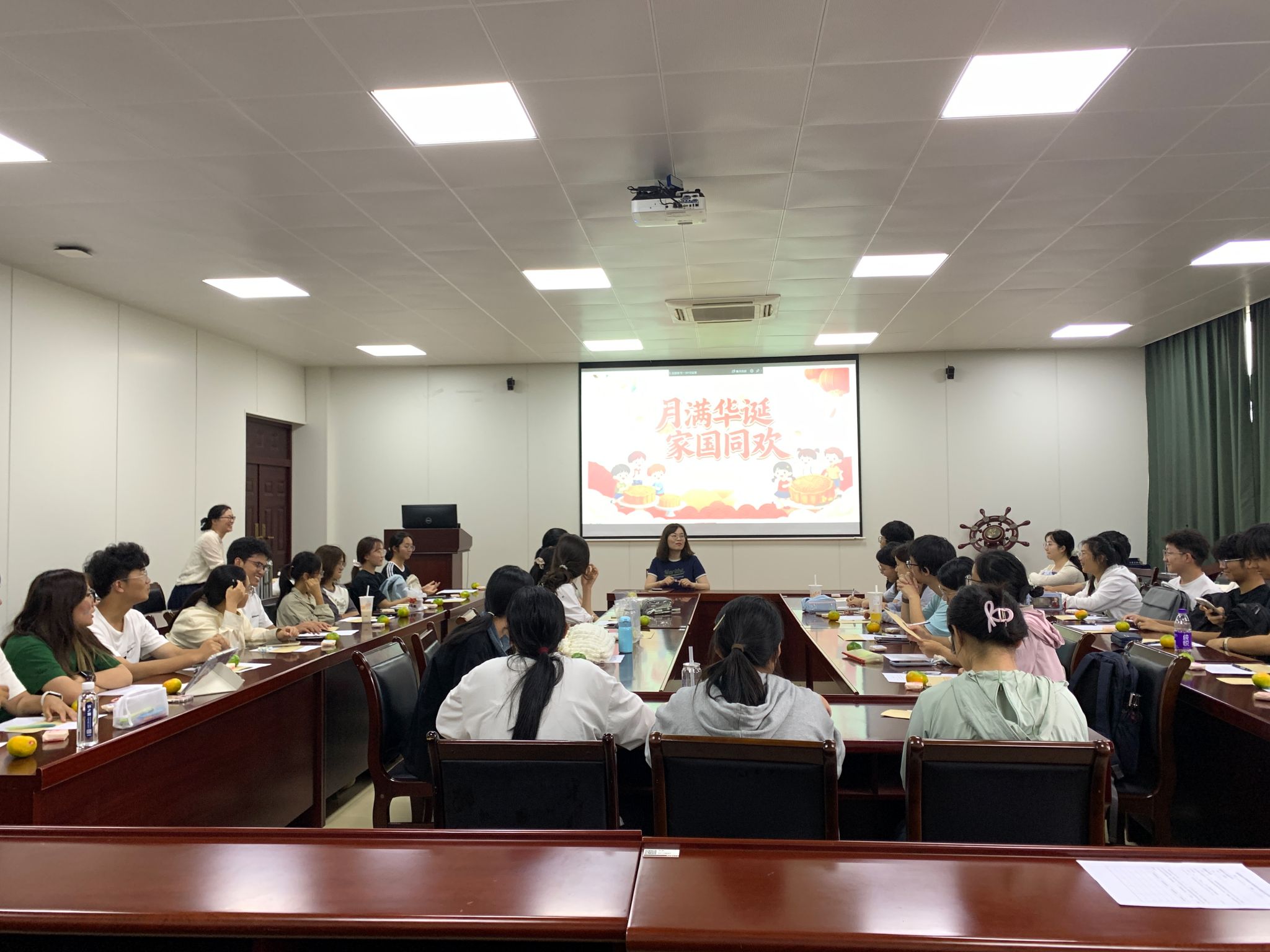 学院会议室里,暖意融融。贾亦璞副书记、辅导员老师与同学们围坐在一起,大屏幕上 “月满华诞 家国同欢” 的字样格外醒目,既蕴含着对中秋佳节阖家团圆的美好期许,又满含着对祖国母亲繁荣昌盛的深情祝福。贾书记亲切地同大家交流,分享双节的感悟与祝福,随后将一个个月饼递到同学们手中。这小小的月饼,承载的是学院对学子们的拳拳关怀,让远离家乡的同学们,在校园里也能真切感受到家一般的温馨与温暖。