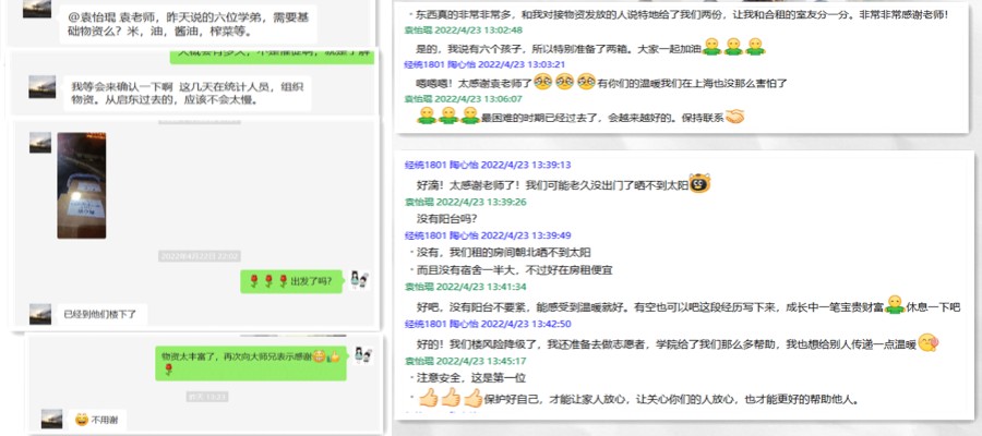 我院第一时间在校友班级群中发布求助信息,党委书记陈耀辉老师亲自动员。统计032班校友迅速响应,身在上海的校友纷纷出谋划策。4月22日晚10点,一名身在启东的校友经多方努力,为受困学妹们送去了包括米、油、面粉、酱油、榨菜、玉米等在内两大箱基础物资。仅用2天时间,在全域静态管理下的上海,完成了几乎不可能完成的爱心援助,书写下跨越15载的校友之情,滞留上海的毕业生十分感动,在经院毕业生的心中更埋下了爱的种子、情的力量。