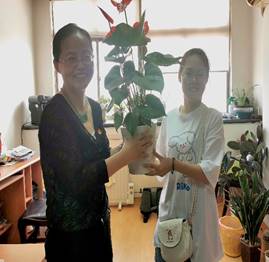 “老师,这个是‘红掌’,代表着大展宏图,它的色泽明艳,特别适合放在办公室。”