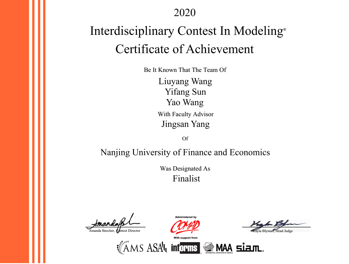 日前,2020年美国大学生数学建模竞赛结果公布,我院学子在此项赛事中取得优异成绩,获得特等奖提名1项、一等奖1项。
