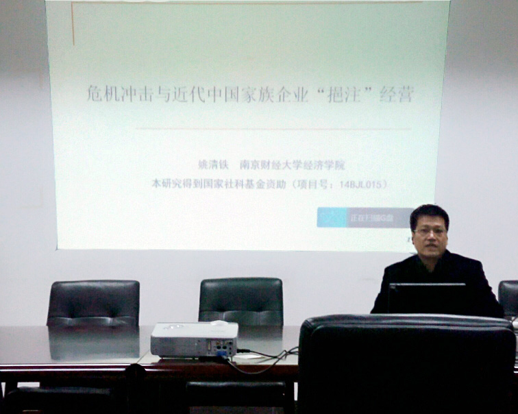 12月16日晚6点半,在经济学科楼307会议室,我院姚清铁博士为全校师生举行了一场题为《危机冲击与近代中国家族企业“挹注”经营》的学术报告,汇报了他正在主持的国家社科项目的阶段性研究成果。