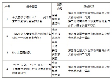本次比赛,我院派出的4支参赛队伍,经过与来自全国高校二百多支队伍的角逐,获得了第四届全国大学生市场调查与分析大赛总决赛2个一等奖、2个二等奖,其中1支队伍(今天的孩子缺什么?——关于南京市学生学习生活的调查)从百所高校两百余支团队中脱颖而出,作为胜出的十支大陆代表队之一,与来自台湾地区选拔赛胜出的6支台湾代表队进行了两岸总决赛的最后比拼,获得第三届海峡两岸大学生市场调查与分析大赛总决赛三等奖。
