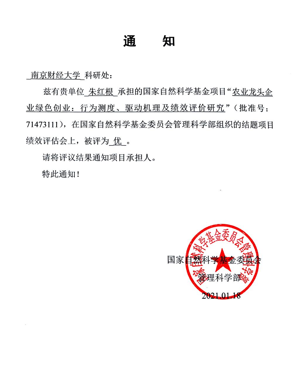其中,我院朱红根教授主持的国家自然科学基金面上项目“农业龙头企业绿色创业:行为测度、驱动机理及绩效评价研究”(批准号:71473111),被评为“优”等级,这也是朱红根院长连续第3个国家自然科学基金项目结题绩效获得"优"等级。