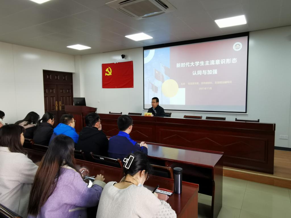石奇部长在仙林校区德经楼307会议室以“新时代大学生主流意识形态认同与加强”为题讲授专题思政课。学院党委副书记袁怡琨、本科生党支部书记黄晓娟以及支部党员、发展对象参加学习。