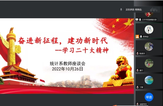 10月26日下午,统计系全体教师举行了教师座谈会。由于疫情的影响,本次座谈会线上进行。适逢党的第二十次全国代表大会召开,本次会议的主题是“学习党的二十大精神,为建设社会主义强国培养人才”,教工支部副书记王平平传达了党的二十大精神,重点针对与国计民生相关的重要内容进行了解读。与会教师认真学习了大会精神,针对相关内容进行了讨论,表达了为建设社会主义强国培养栋梁人才的决心。随后,统计系柳杰民老师针对即将开始的海峡两岸大学生市场调查大赛进行了指导及动员,建议老师们积极参与,认真选题,与学生密切沟通,争取在明年的国赛中再获佳绩。