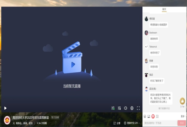 在江西省现场高招咨询如火如荼进展中,bat365在线登录网站注册赠送36同时开办了江西省综合场高招政策解读网络直播咨询会。网络直播咨询会前,bat365在线登录网站注册赠送36广大江西籍师生通过QQ群、微信群、视频号等社交媒体向家乡广泛宣传网络直播咨询会。咨询会当天,4.3万人在线咨询我校报考政策和相关情况,工作组老师的精准解答和热心解惑,获得了家长和学生们的一致好评,点赞量达3.1万人。