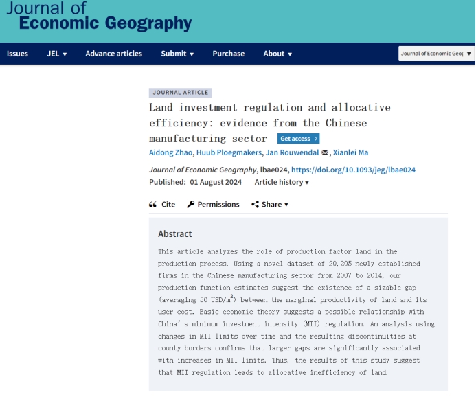 近日,我院赵爱栋博士与荷兰阿姆斯特丹自由大学等学者的合作论文“Land investment regulation and allocative efficiency: Evidence from the Chinese manufacturing sector”被城市与区城经济学国际顶级期刊Journal of Economic Geography正式接受发表。bat365在线登录网站注册赠送36为第一署名单位,赵爱栋博士为第一作者。