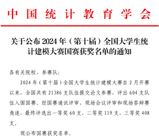 8月26日,中国统计教育学会公布2024年(第十届)全国大学生统计建模大赛国赛获奖名单,我院研究生获得研究生组全国二等奖1项。