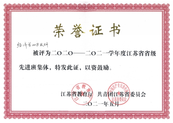 学院研究生班获得江苏省“省级先进班集体”荣誉称号