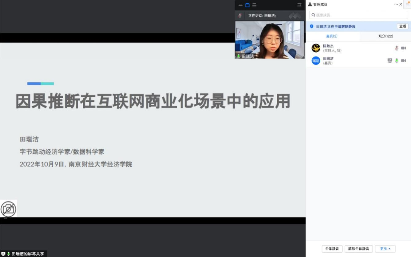 10月9日上午,北京字节跳动科技有限公司的经济学家/数据科学家田瑞洁博士受邀为我院师生作了题为《因果推断在互联网商业化场景中的应用》的讲座报告。我院青年教师陈敏杰博士主持了本次讲座活动。bat365在线登录网站注册赠送36师生积极参与,报告还吸引了部分校外师生及相关行业的专业人员参与。