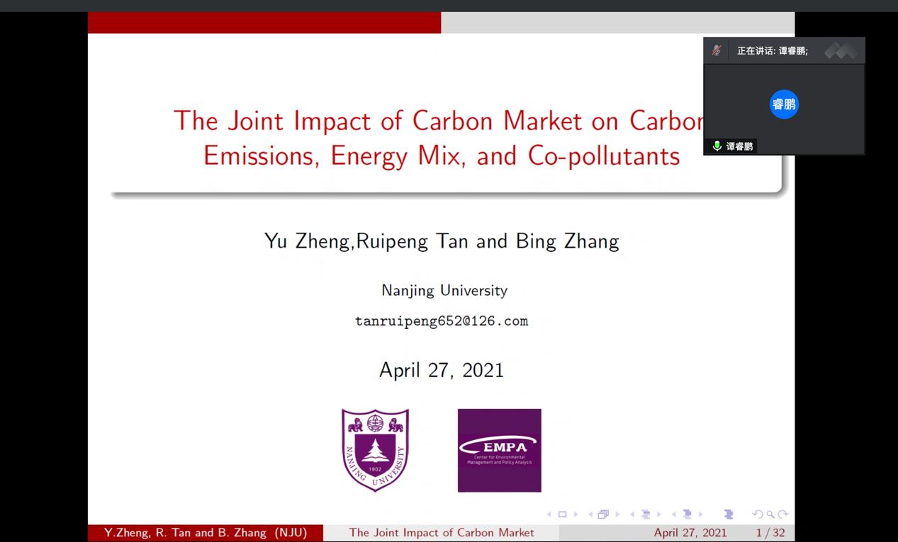 4月27日下午,南京大学环境学院谭睿鹏老师,在腾讯会议为我院师生带来《The Joint Impact of Carbon Market on Carbon Emissions, Energy Mix, and Co-pollutants》的专题学术讲座。
