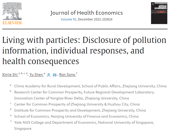近日,我院青年教师沈煜博士以通讯作者的学术论文“Living with particles: Disclosure of pollution information, individual responses, and health consequences”在Journal of Health Economics在线发表,以第一作者的学术论文“The effect of low-carbon city pilot on energy consumption behavior: Evidence from China”在Energy Economics在线发表。