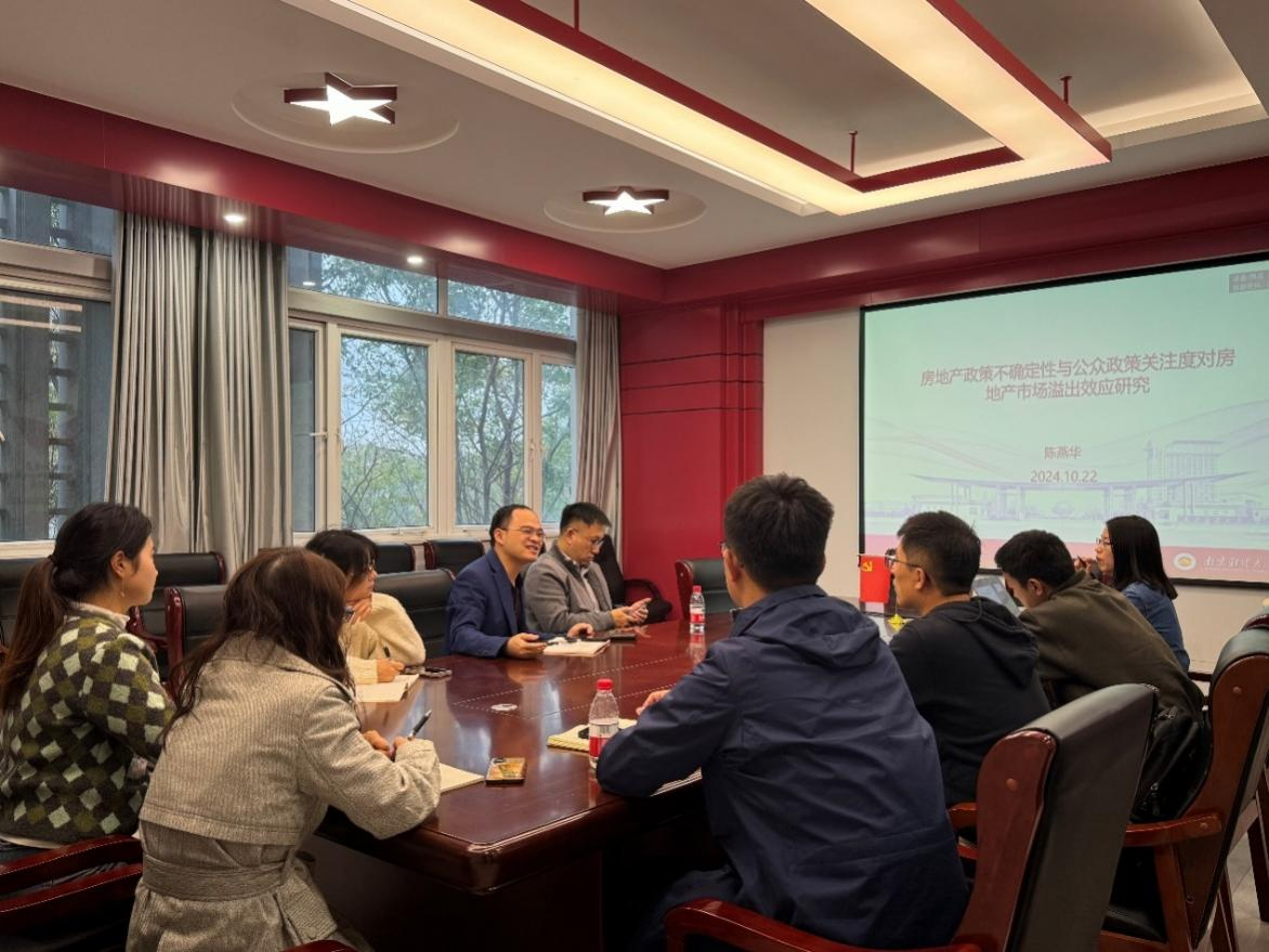 10月22日下午,我院在德经楼会议室329举办了双周学术论坛。本期论坛由陈燕华老师带来主题为“房地产政策不确定性与公众政策关注度对房地产市场溢出效应研究”的学术交流。陈杰副教授主持了本次学术论坛,学院部分教师参与。